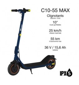(90 cm) et roues 10'' pour assurer un confort supérieur lors de vos trajets. La C10-55 MAX est une trottinette adaptée à toutes les morphologies. Optimisation du confort de conduite grâce aux larges poignées / levier de frein. Large Deck, grande potence, roues 10'' et amortissement des chocs avec ses chambres à air.