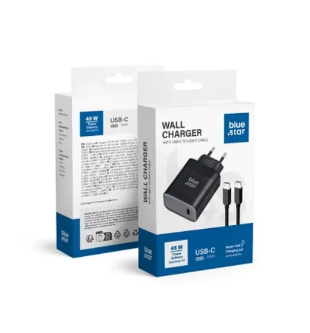 Chargeur mural Blue Star avec fonction de charge rapide. Compatible avec les normes Quick Charge et Power Delivery, il permet de recharger instantanément les appareils compatibles. Câble USB -C vers USB -C détachable inclus.